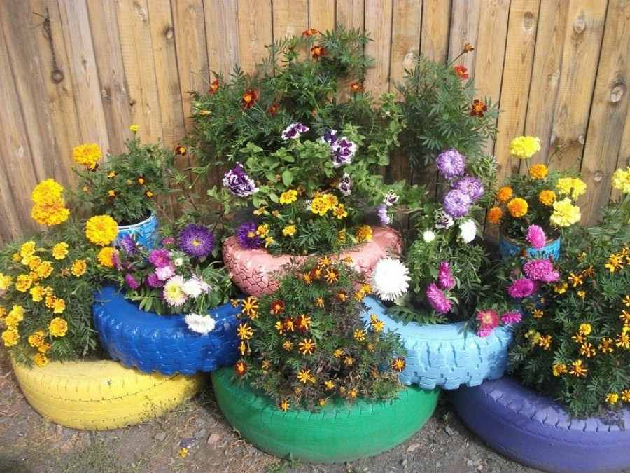 Многообразие поделок-новинок представлено на фото: это оригинальные цветники из кирпича и старых поленьев, подвесные клумбы из клеток для птиц, садовая обстановка из поддонов, сухие «ручейки» из пластиковых бутылок, декор для забора в виде цветов и многое другое.