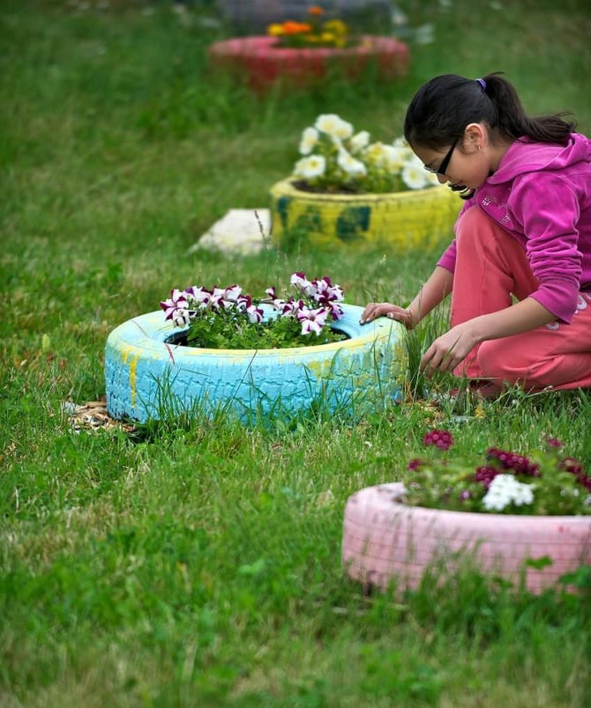 Из старых покрышек можно смастерить массу полезных для дачи вещей. Это не только клумбы, садовая мебель, но детские качели. Даже самая простенькая конструкция, как правило, вызывает у ребёнка дикий восторг.
