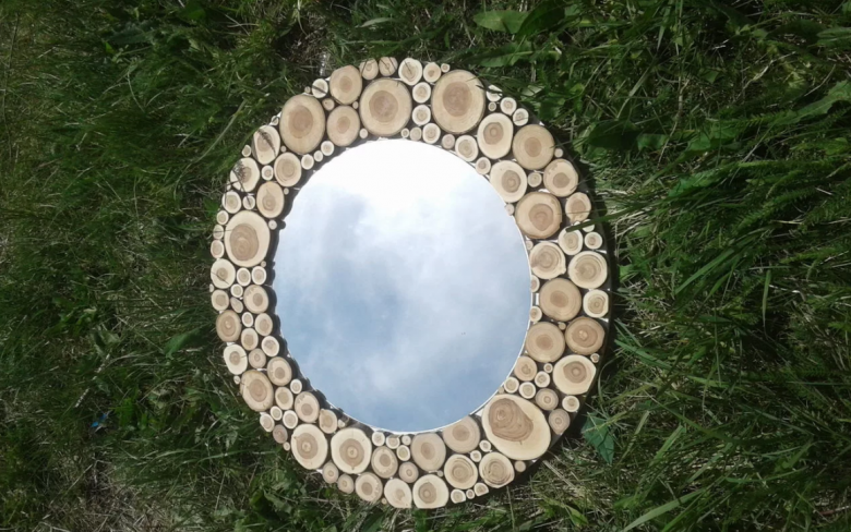 Чтобы сделать обрамление из спилов для зеркала или фоторамки понадобится прочная основа, например из фанеры. Её размеры должны быть больше размера зеркала. Основу можно зашлифовать наждачной бумагой и покрасить. Приклеивать деревянные кругляши можно с помощью термоклея, а само зеркало к основе необходимо приклеить с помощью жидких гвоздей. Также не забудьте приделать крепление, с помощью которого будете крепить зеркало к стене.