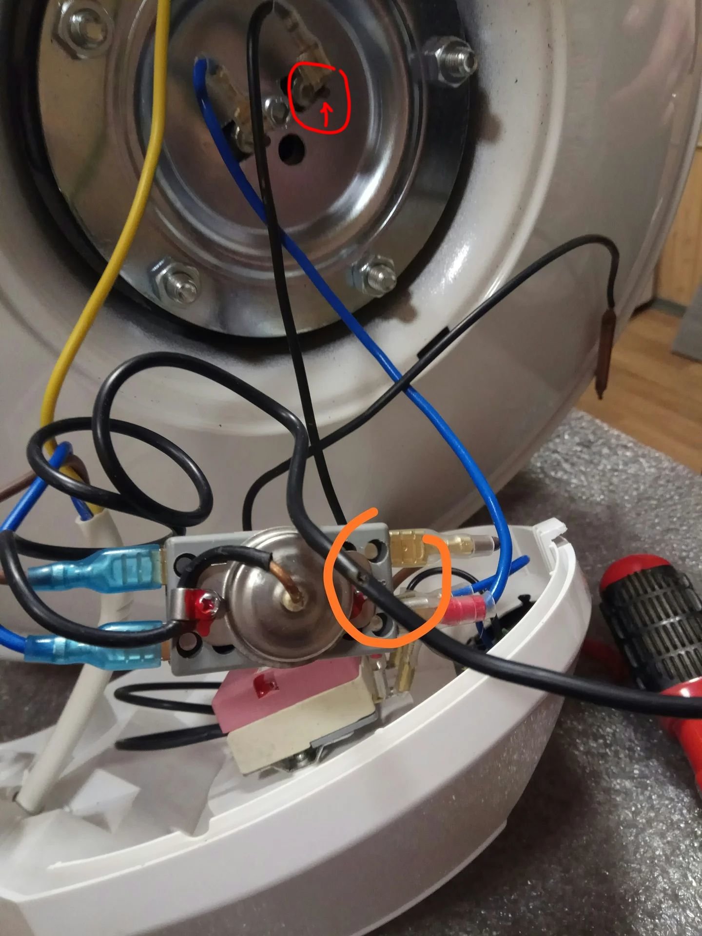 7. Для замены ТЭНа нужно отсоединить три провода: красный, синий и желтый.