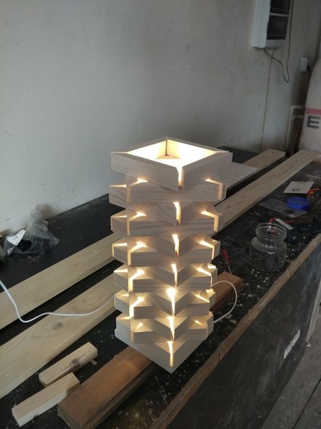 Начнем с простенького настольного или напольного деревянного светильника, изготавливаемого из деревянных конусных дощечек. Светильник имеет очень простую форму, элементарно создается и при этом достаточно эффектно смотрится и когда включен и когда выключен.