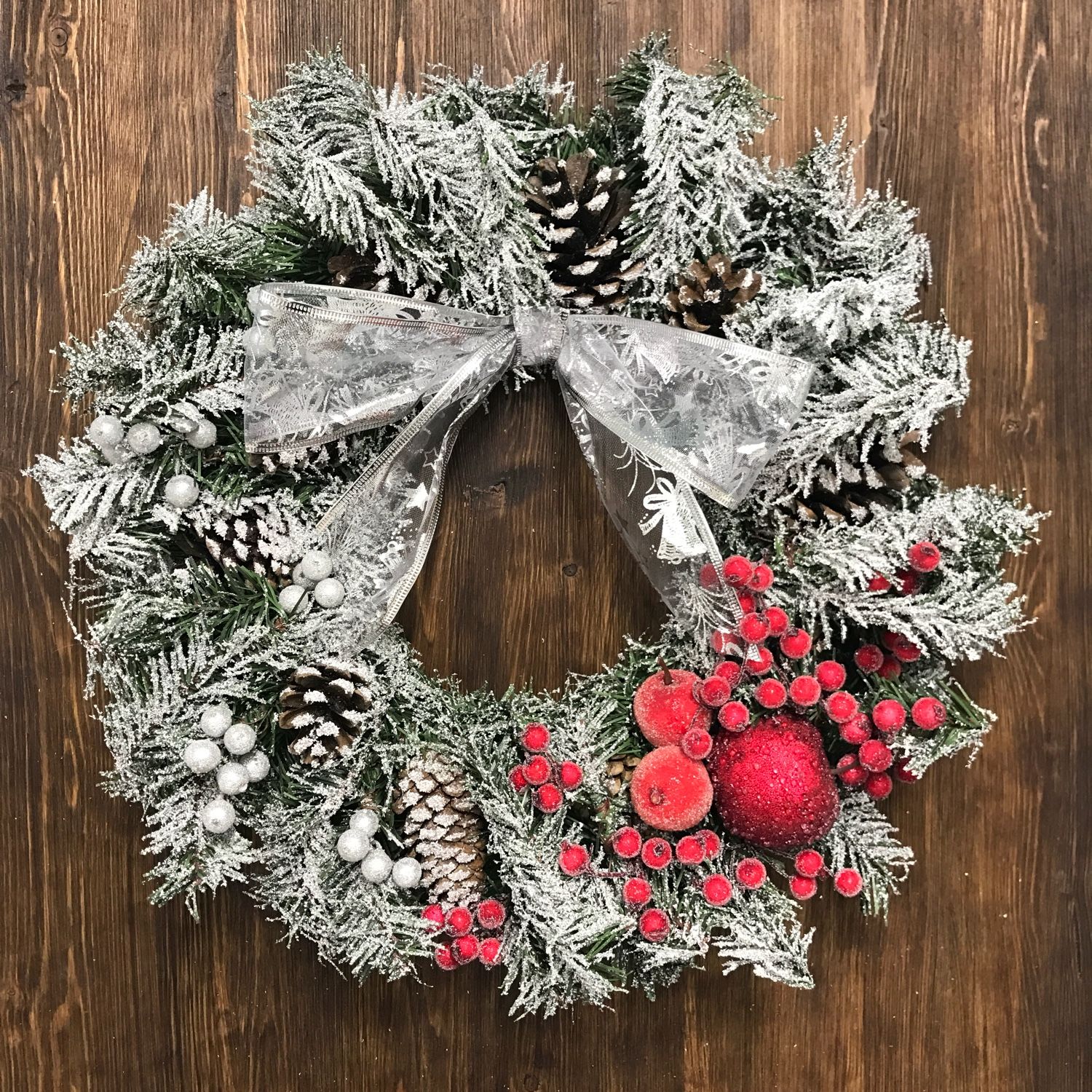 Такой новогодний венок смотрится очень колоритно. Как правило выполнен он в красных тонах, но частенько красный заменяют на нежно-розовый, либо белый вариант.