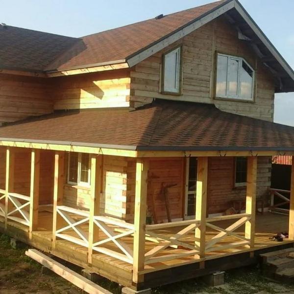 Традиционно, крыша немного наклонена, а для создания красивой веранды, её кровля должна сочетаться с остальной частью дома.
