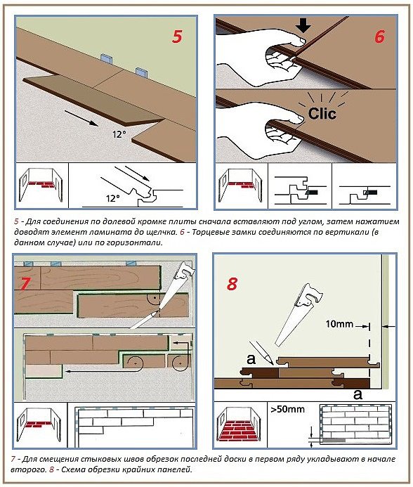 Если проводится укладка ламината своими руками пошаговая инструкция имеет некоторые отличия, которые будут вытекать из типа соединения элементов.